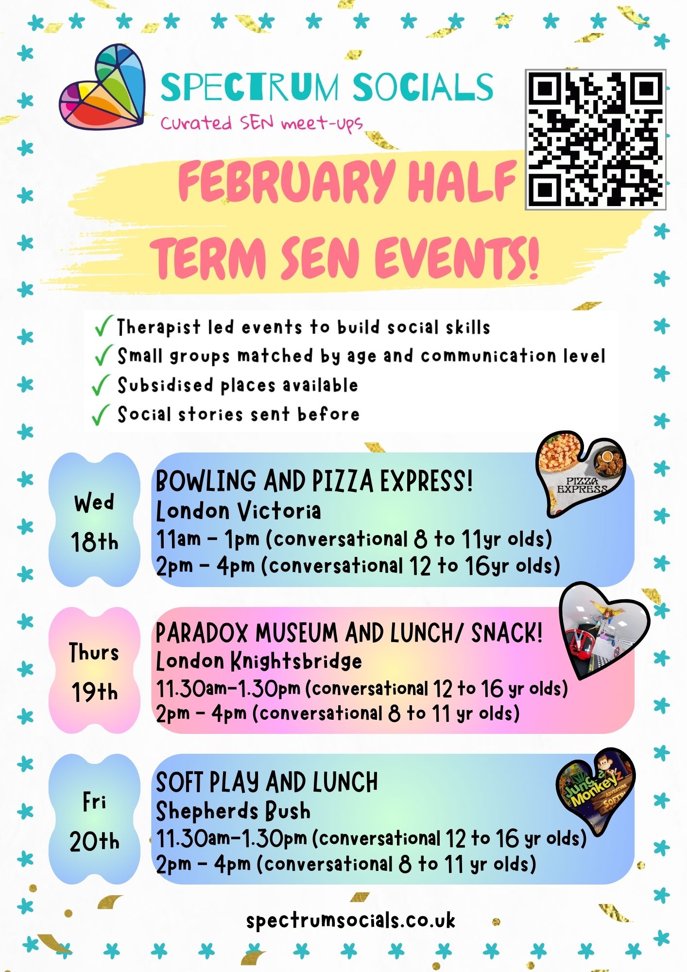 Examples of events: Trampolining and play, bowling and pizza, Paradox Museum and lunch, soft play and lunch, Hyde Park pizza and pedalos.