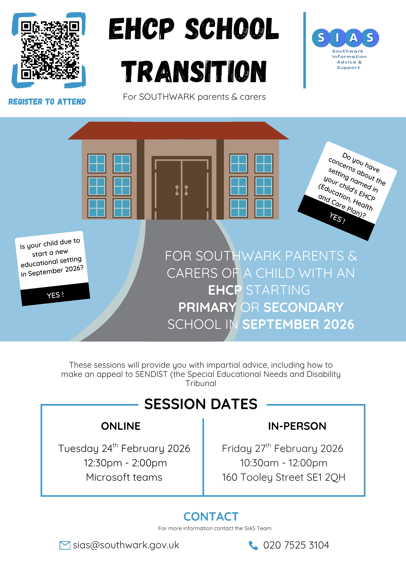 These sessions are to provide information, advice and support to parents/carers of a child with a EHC Plan, due to transition to Primary or Secondary school in September 2026. By the 15th February 2026, parents/carers should receive a final amended EHC Plan naming the school or the 'type' of school for the child to attend in September 2026.