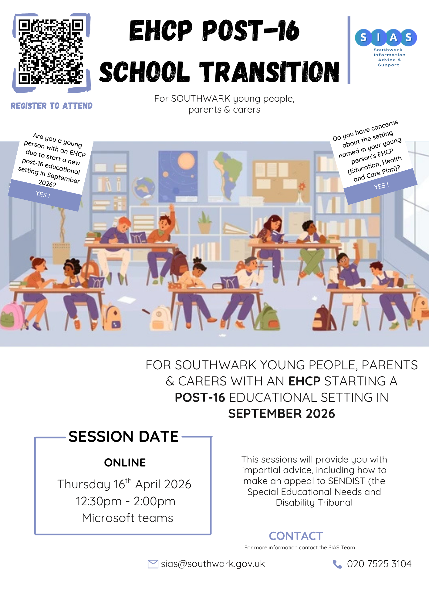 These sessions are to provide information, advice and support to young people with an EHC Plan and their parents/carers, who are due to transition to Post-16 in September 2026. By the 31st March 2026, you should receive a final amended EHC Plan naming the setting or the 'type' of setting for the young person to attend in September 2026.
